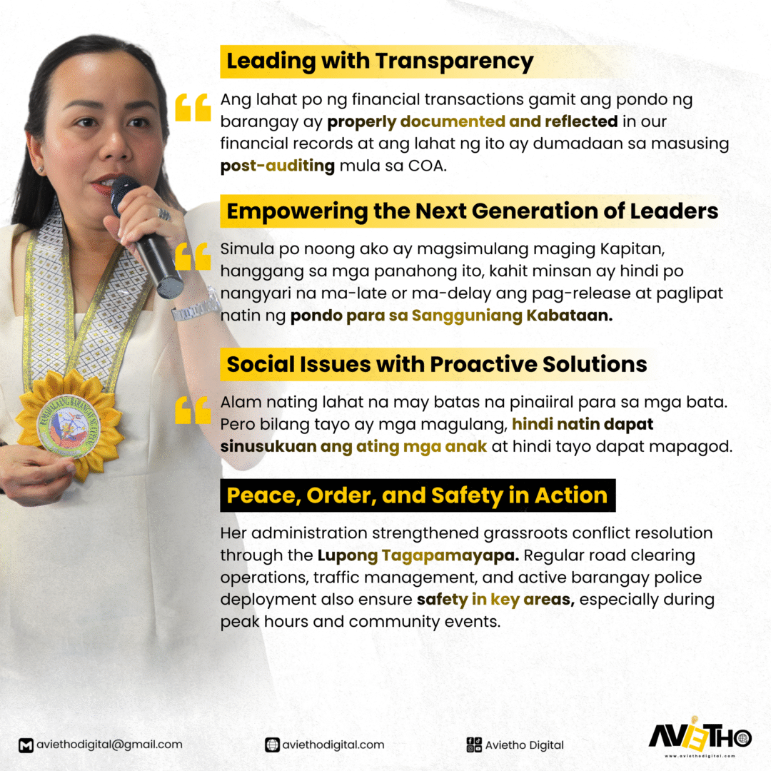 She further underscored a track record of consistency: “Simula po noong ako ay magsimulang maging Kapitan, hanggang sa mga panahong ito, kahit minsan ay hindi po nangyari na ma-late or ma-delay ang pag-release at paglipat natin ng pondo para sa Sangguniang Kabataan.”