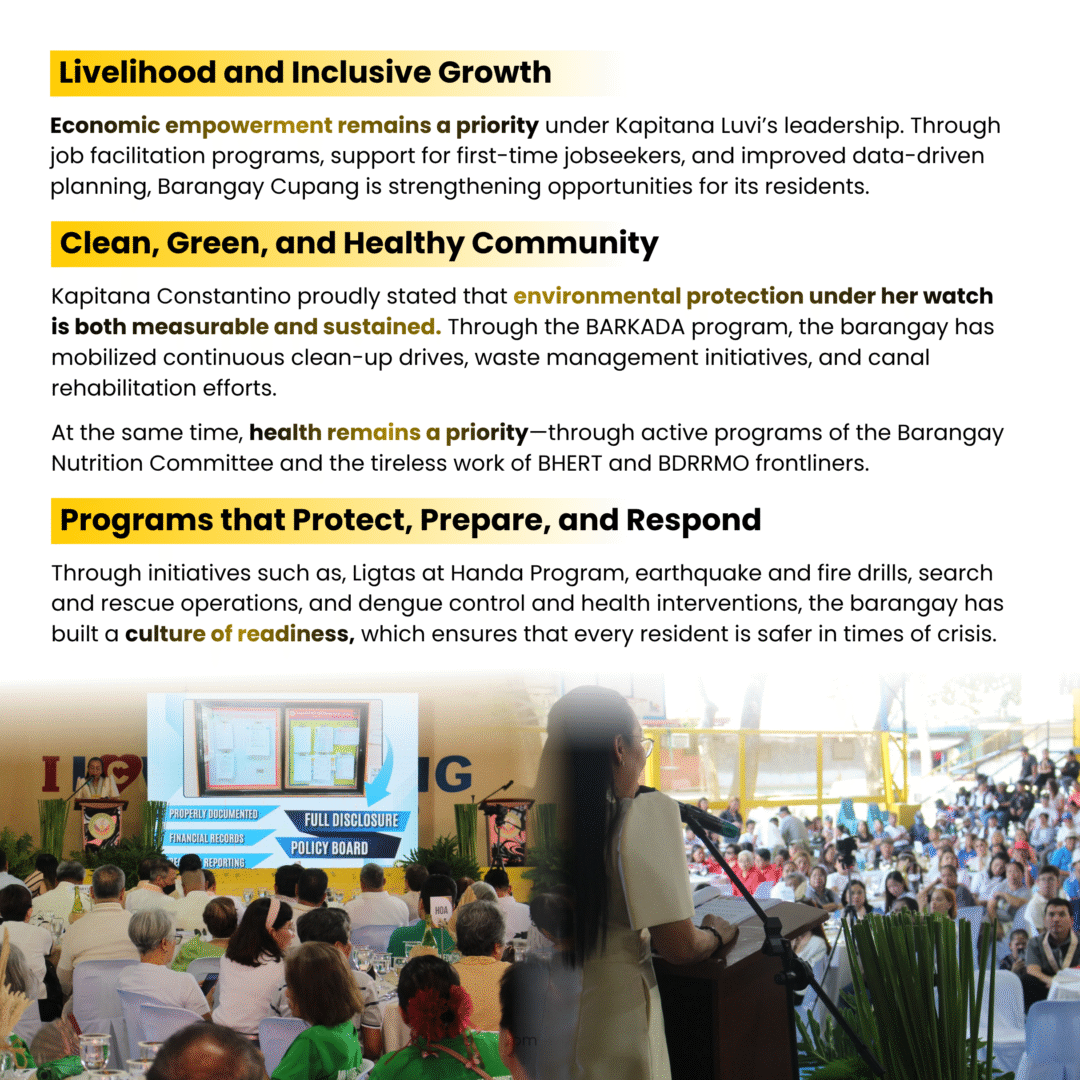 Highlighting seven priority sectors, her address reflected a comprehensive approach to governance, balancing accountability, social services, and community empowerment—all while reinforcing the vision of a progressive and resilient Barangay Cupang.