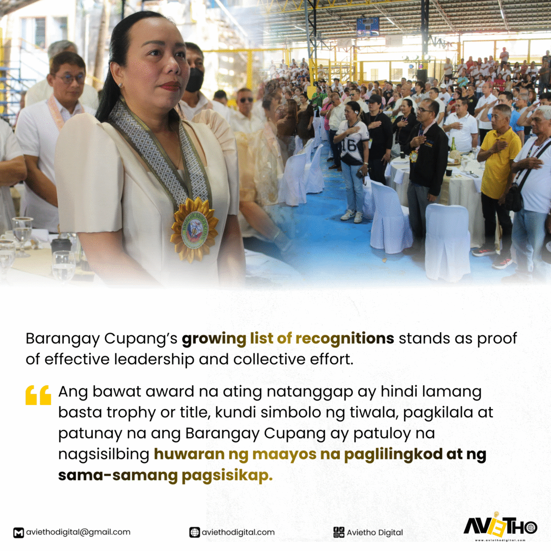 “Ang bawat award na ating natanggap ay hindi lamang basta trophy or title, kundi simbolo ng tiwala, pagkilala at patunay na ang Barangay Cupang ay patuloy na nagsisilbing huwaran ng maayos na paglilingkod at ng sama-samang pagsisikap.”