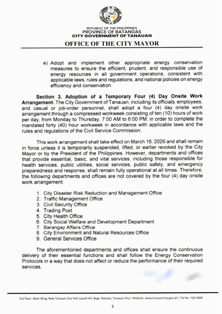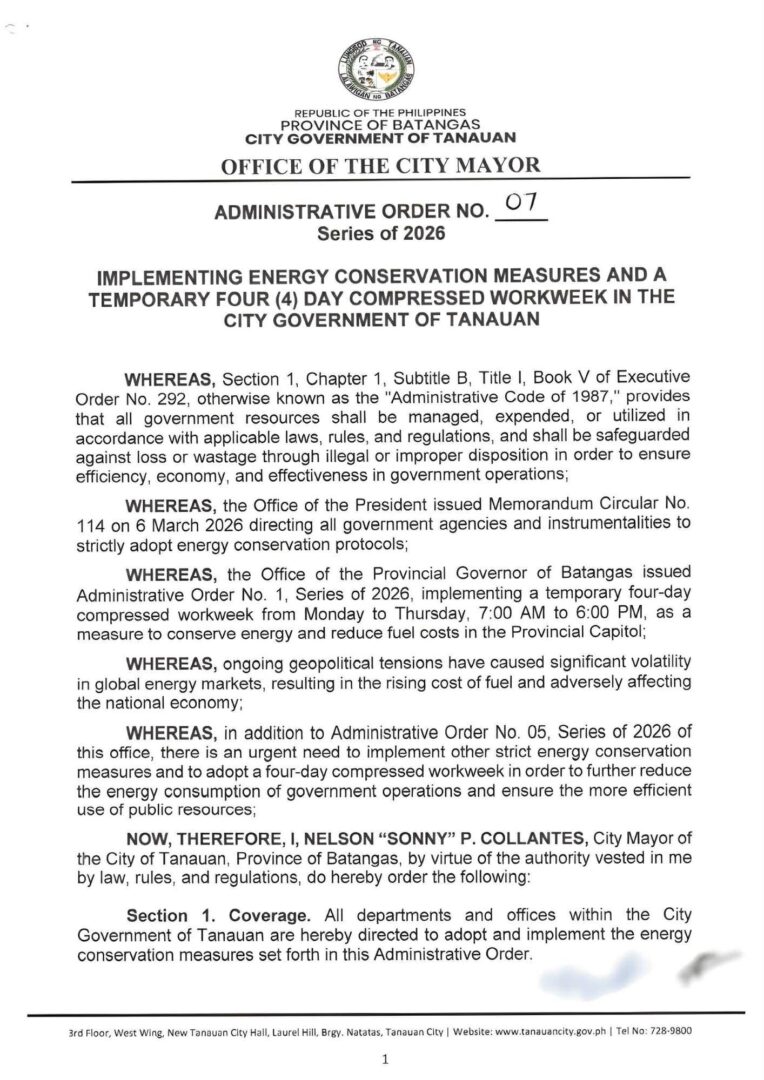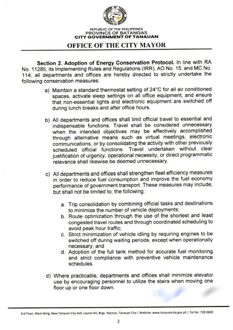 Complementing these national efforts, Mayor Collantes has proactively implemented local energy conservation measures. These include the adoption of a compressed four-day work week in the city government and the issuance of Administrative Order No. 05, Series of 2026, mandating a 30% fuel reduction and electricity conservation across all departments.