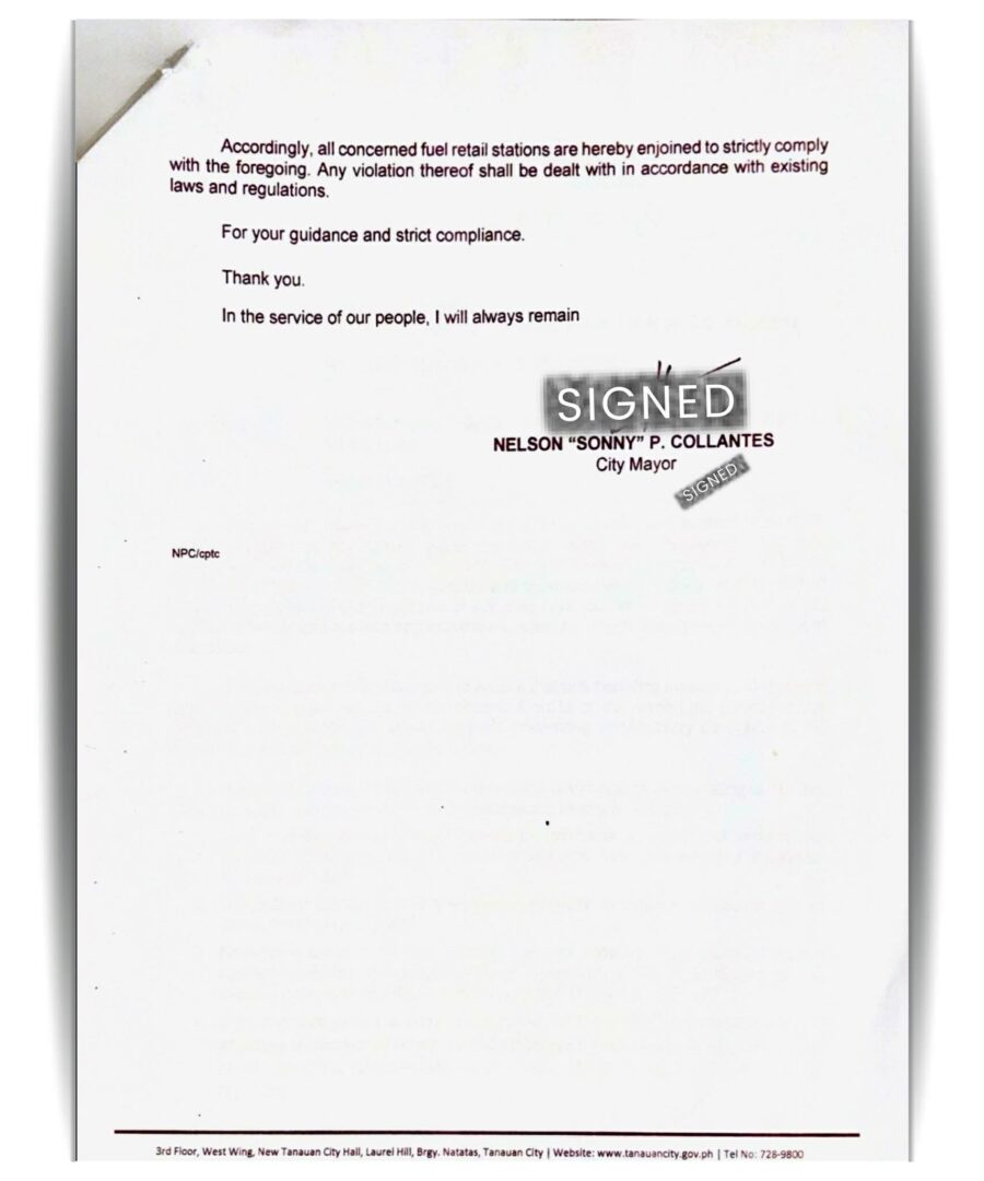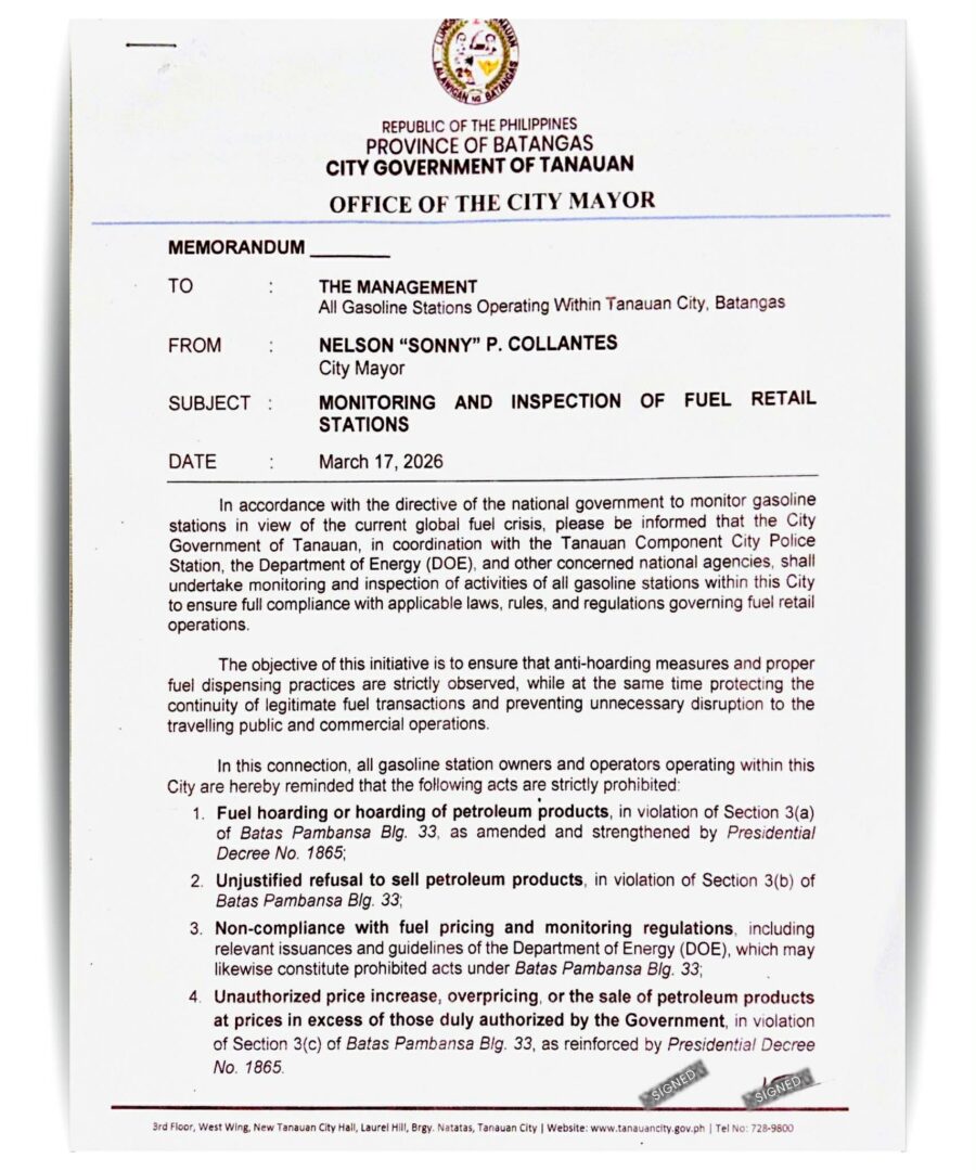 In a decisive move to safeguard the welfare of Tanaueño consumers, Mayor Sonny Perez Collantes has ordered the strict monitoring and inspection of all fuel retail stations across the City of Tanauan.